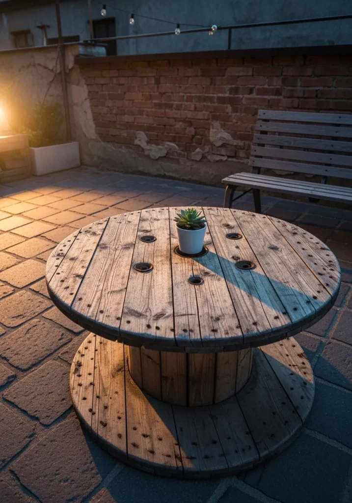 A large wooden cable spool has been transformed into a round outdoor coffee table, placed at the center of a cozy terrace corner. The circular top shows visible wood grain, small knots, and natural imperfections that add rustic charm. The thick base makes it sturdy, while the warm evening light hitting the surface highlights its texture beautifully. Surrounded by simple paving and brick walls, it becomes the main focal point of the space.
