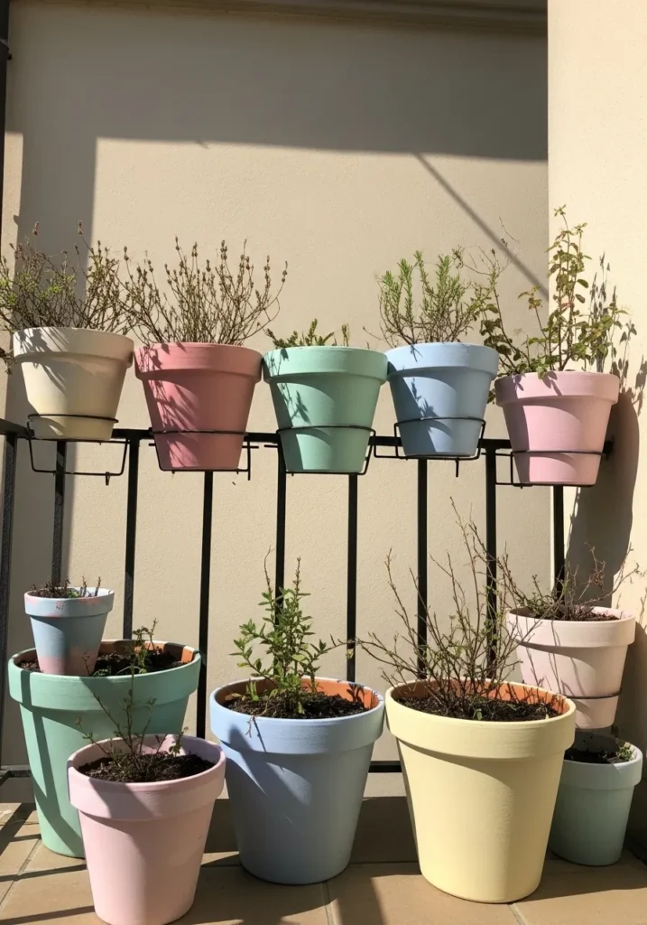 A row of pastel colored flower pots in soft pink, mint, and pale yellow tones stands neatly against a sunlit wall. The pots are arranged at different heights using simple metal stands, creating a layered garden effect. The colors brighten the terrace instantly while keeping the overall look light and playful.