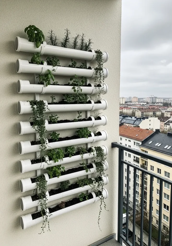White PVC pipes are mounted vertically along a terrace wall, each opening filled with small trailing plants. The clean white structure contrasts beautifully with the greenery and the city skyline beyond the railing. The design is compact and perfect for narrow balconies.