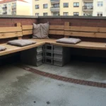 This terrace features an L shaped bench built from stacked concrete cinder blocks topped with thick wooden planks. Soft neutral cushions are placed along the seating, softening the industrial feel of the blocks. The brick walls surrounding the space add texture and warmth to the overall look.