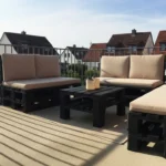 Stacked wooden pallets form the base of this cozy terrace sofa, topped with thick cushions in soft beige and warm gray tones. A few layered pillows and a casual throw make it feel inviting and relaxed. The low profile design works perfectly in a compact terrace setting.