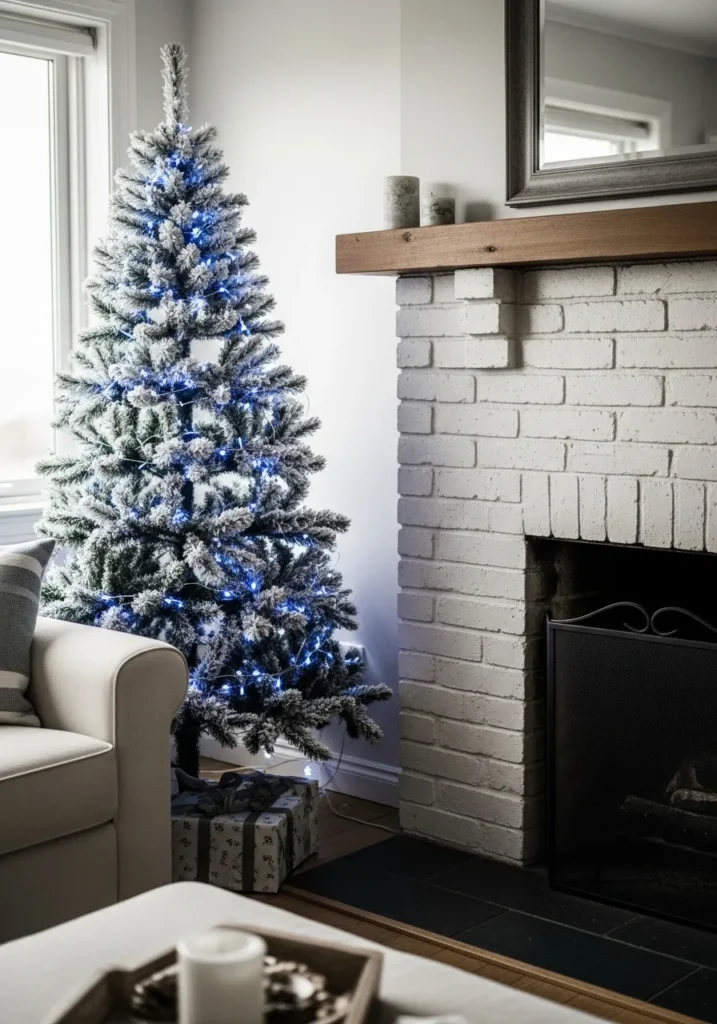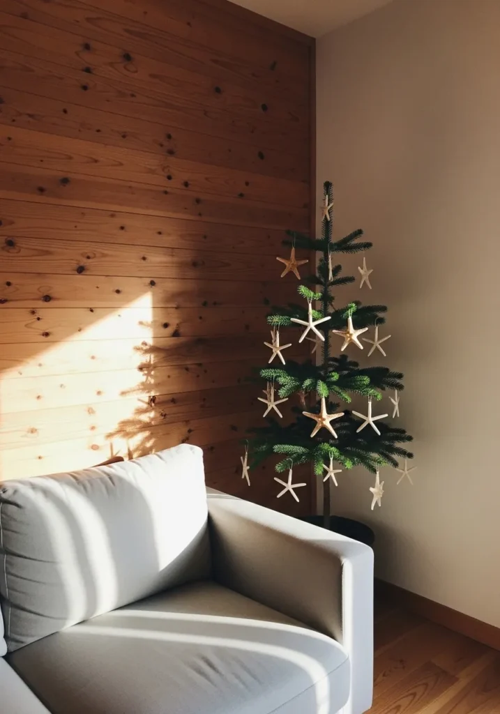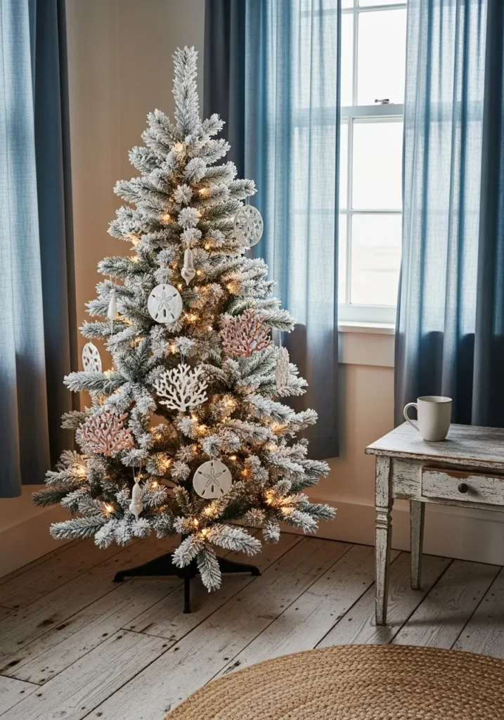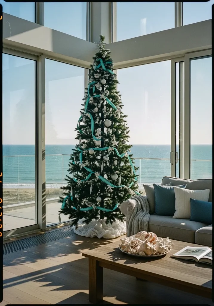 This Christmas tree captures that dreamy coastal look with frosted branches, glowing fairy lights, and ornaments shaped like sand dollars and coral. The soft blue curtains and weathered side table add to the cozy seaside vibe, giving the space a fresh, beachy twist on a winter classic.