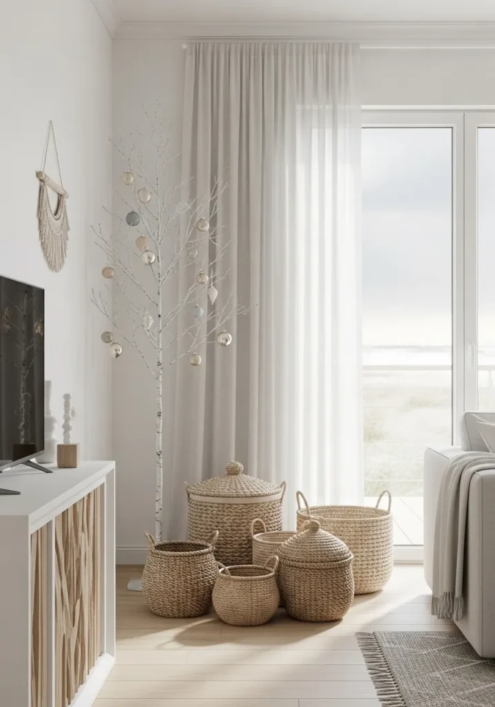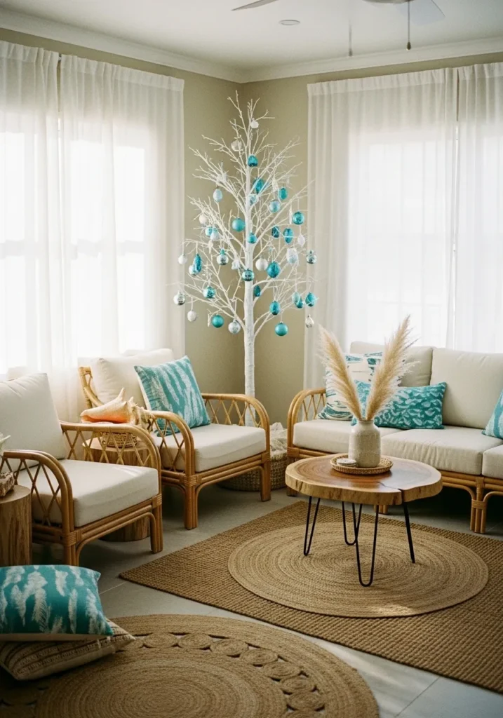 This bright and airy living room pairs a minimalist white tree with shimmering turquoise ornaments that pop against natural wicker furniture. The woven textures, soft cushions, and coastal hues make the whole space feel relaxed and breezy, like a seaside retreat in December.