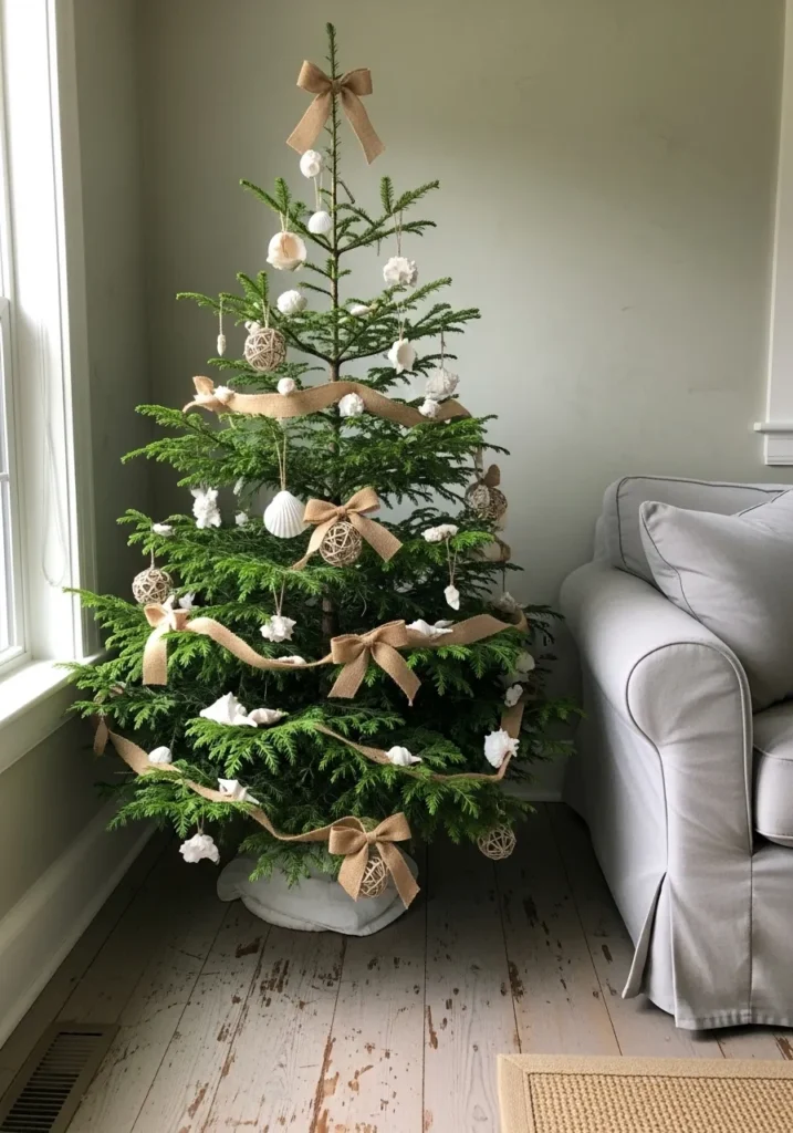 I find this design so refreshingly real. It’s the kind of tree that feels homemade but still stylish. The seashell touches are subtle, and the burlap gives it such a cozy, organic feel—I could honestly leave this up all winter.