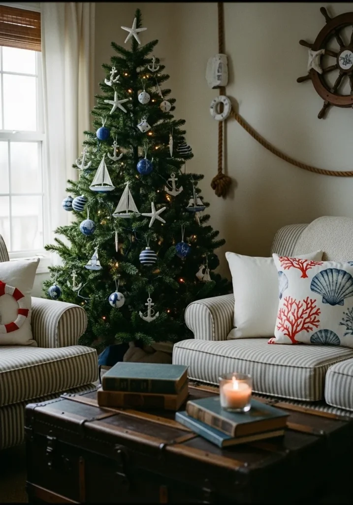 This tree brings the seaside indoors with blue-and-white ornaments shaped like sailboats, anchors, and starfish. Surrounded by striped furniture and coral-patterned pillows, the whole room feels like a charming coastal cabin ready for Christmas.