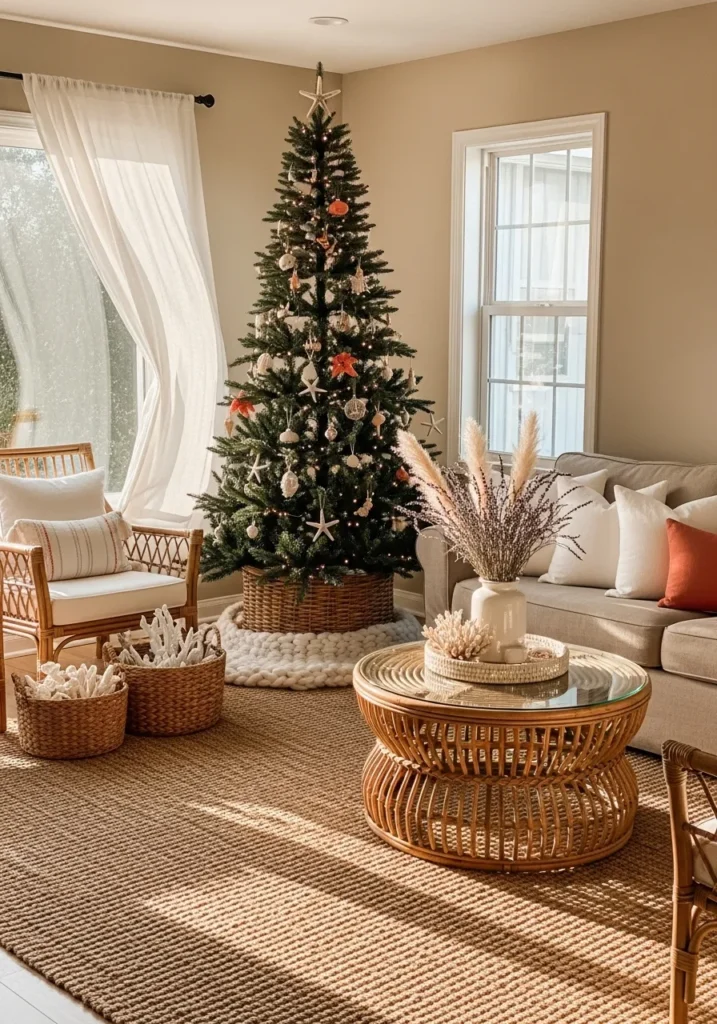 This sunlit living room feels like a warm December afternoon by the shore. The tall Christmas tree stands proudly in a woven basket base, dressed in starfish, coral ornaments, and soft neutral ribbons. The rattan furniture, woven rugs, and coastal decor make the whole space glow.
