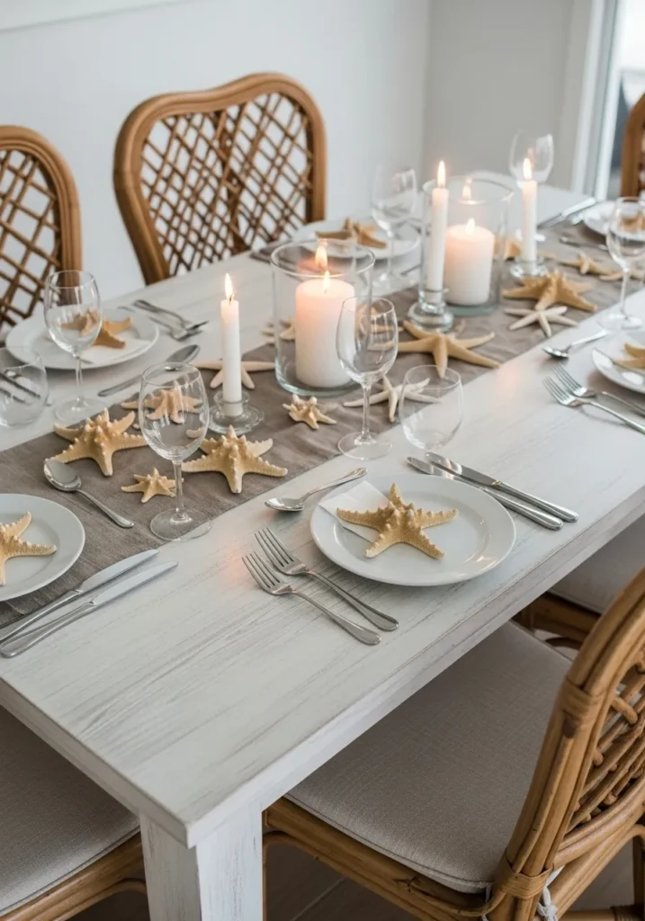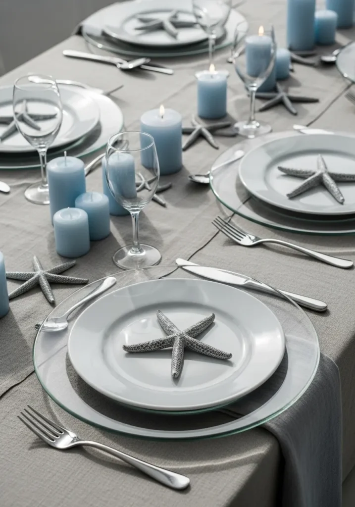 Here’s a table that feels as fresh as a sea breeze on a winter morning. Pale gray linens pair beautifully with frosty blue candles and silver starfish accents. The simplicity of the setup makes it elegant, while the cool tones give it that soft, wintry coastal feel that’s both festive and relaxing.