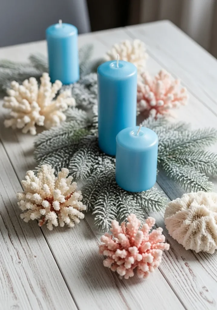 Cool blue candles and frosted coral accents bring an unexpected twist to traditional holiday decor. The combination of soft pink corals and snowy greenery creates a magical underwater Christmas effect. It’s bright, airy, and full of texture without ever feeling overdone.