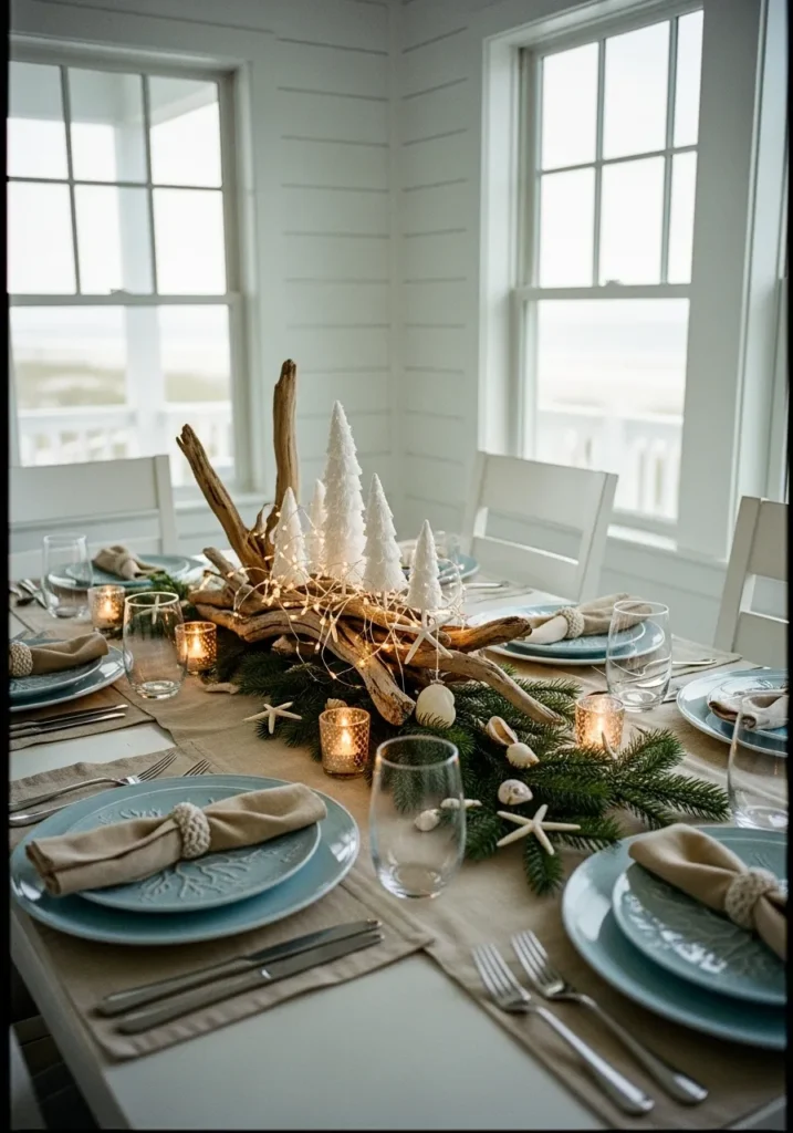 I can’t get over how magical this looks. The driftwood centerpiece feels so creative and unique, especially with the tiny lights wrapped around it. It’s cozy, whimsical, and perfectly coastal for the holidays.