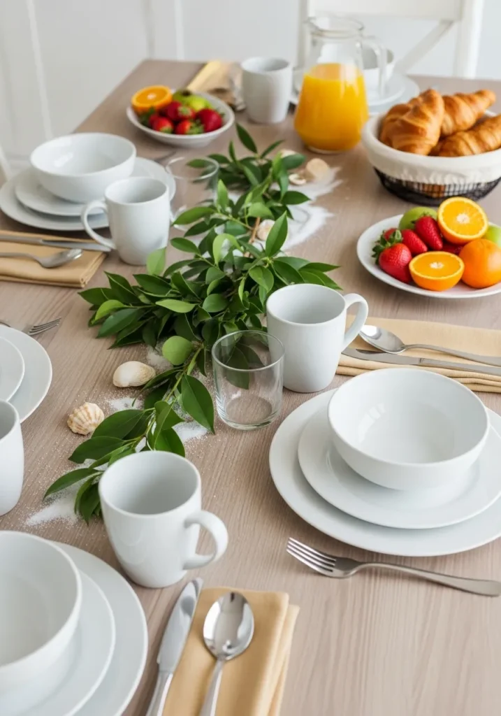 This setting is bright, cheerful, and effortlessly coastal. Crisp white dishes, sandy beige napkins, and fresh greenery create a clean, airy look. The seashells sprinkled along the center feel playful, while the fruit and croissants bring a touch of everyday warmth. It’s casual coastal living at its best.