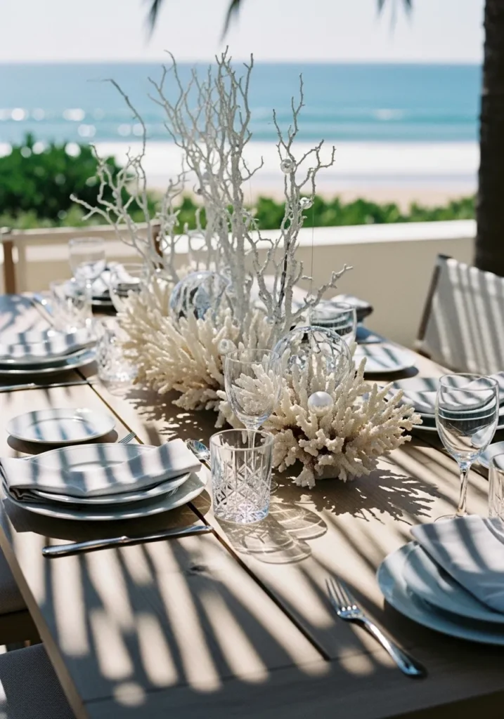 This table captures the magic of the ocean with its striking coral centerpieces and shimmering ornaments. Set against a backdrop of ocean views, the white and silver color scheme feels crisp and refreshing. The coral branches stand tall and sculptural, bringing drama and elegance to the setting.