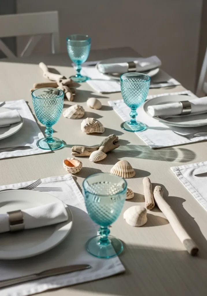 This table is all about light and texture. The soft, neutral tones of driftwood and seashells pair beautifully with turquoise glass goblets that catch the sunlight. The clean white linens keep it airy, while the scattered shells add a relaxed, coastal charm perfect for Christmas by the water.