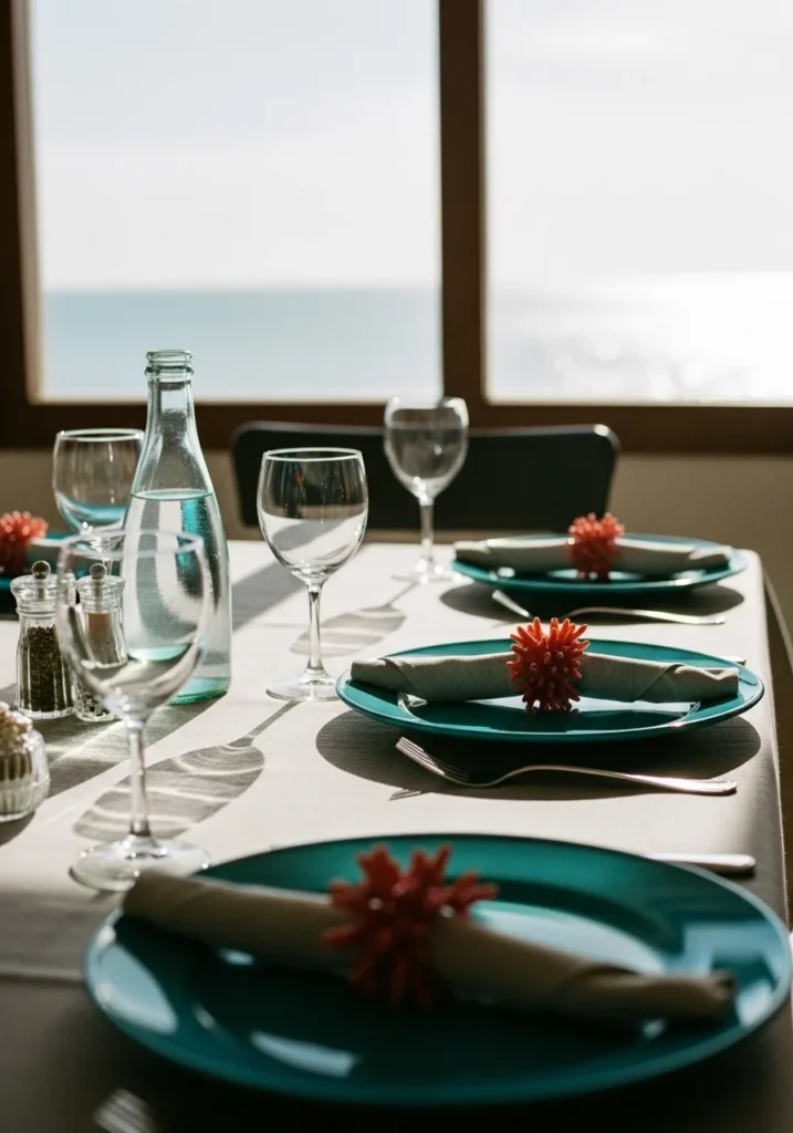 This setting captures the pure serenity of ocean hues with its turquoise plates and minimalistic table setup. The sunlight streaming through the window highlights the water-inspired palette, while small coral-like napkin decorations add a festive touch that feels refreshingly coastal. Glassware sparkles in the light, mirroring the shimmer of the sea just outside.
