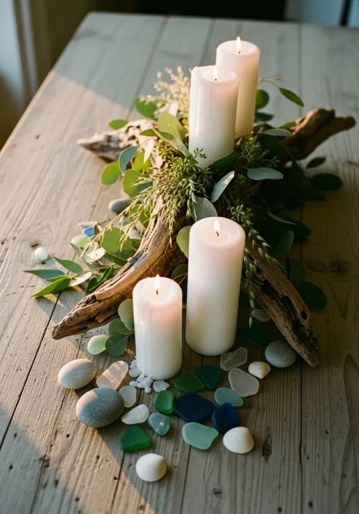 This centerpiece feels like a peaceful walk along the shoreline. Smooth sea glass, beach stones, and driftwood come together with glowing pillar candles and fresh greenery for a natural, earthy look. The textures are simple yet stunning, with soft candlelight bouncing gently off each surface.