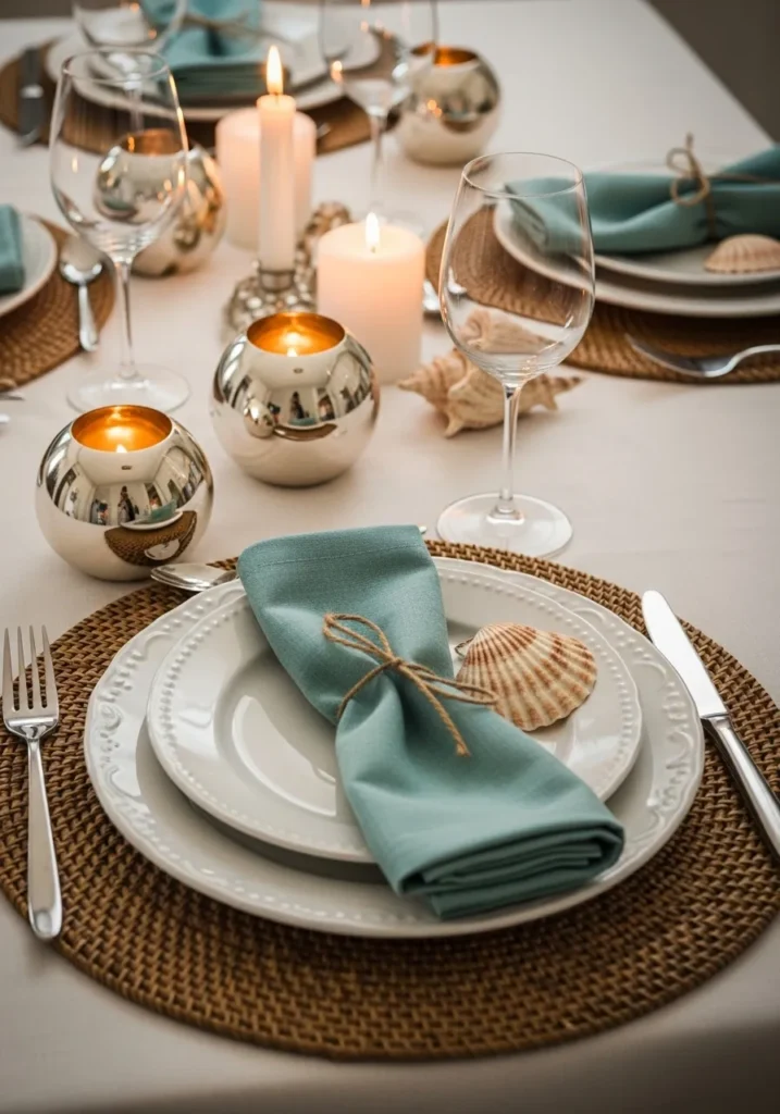 A soothing palette of aqua, white, and natural rattan gives this table a breezy coastal glow. Each place setting features a delicate seashell and a neatly tied napkin, while silver votives and candles add a bit of shine. It’s relaxed but polished, like a seaside dinner under twinkling fairy lights.