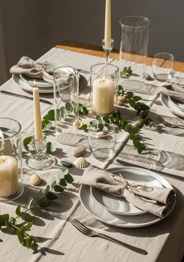 This look keeps things light and simple with a linen tablecloth, soft neutral tones, and touches of greenery. The eucalyptus garland runs down the center, intertwined with candles and seashells for a subtle nod to the coast. Everything feels fresh and uncluttered, perfect for a laid-back Christmas gathering.