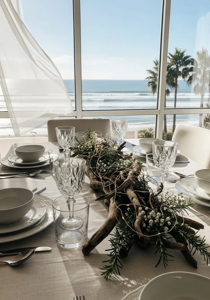 This breathtaking setup overlooks the sea, blending crisp white tableware with a driftwood centerpiece accented by sprigs of greenery and tiny fairy lights. The natural sunlight and gentle breeze create a dreamy coastal Christmas mood that’s elegant and airy.