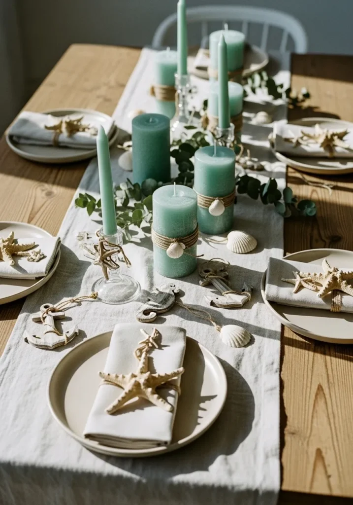 I adore how soothing this setup feels. The sea-green candles glow so beautifully against the wood tones, creating that effortless “coastal chic” vibe. It’s the kind of table that instantly makes me want to pour a glass of white wine and chat for hours while the sun sets outside.