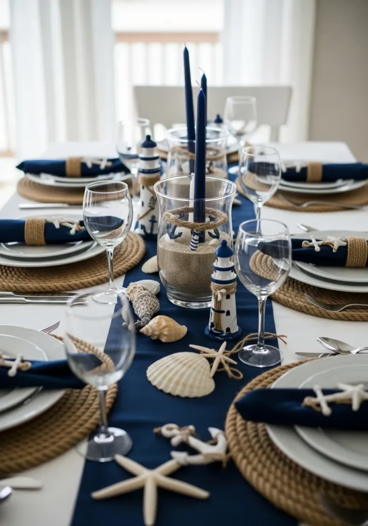 This navy and rope-accented table feels like it came straight from a seaside cottage. The deep blue runner, woven placemats, and tiny lighthouse figurines create such a fun nautical look. Rope-tied napkins and scattered shells bring a beachy flair, while tall navy candles add a festive glow perfect for Christmas by the sea.