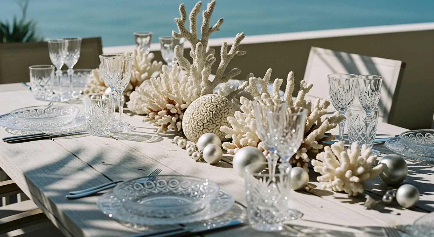 This table glows with a serene mix of coastal textures and holiday sparkle. Creamy linens, glass ornaments, seashells, and driftwood create a stunning blend of seaside charm and festive warmth. The soft candlelight adds a gentle glow that reflects beautifully off the glass and silver accents, making the whole scene feel peaceful and elegant.