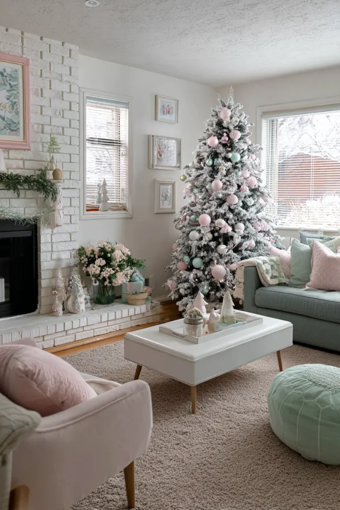 This living room looks like a snow-kissed fairytale brought to life. The flocked Christmas tree glimmers with soft blush, mint, and pearl ornaments that perfectly echo the room’s pastel palette. Every detail feels coordinated yet cozy, from the pink armchair and mint pouf to the textured pillows that make the space feel like a winter retreat. The white brick fireplace and layered greenery add a classic touch that balances the sweetness of the pastel tones.