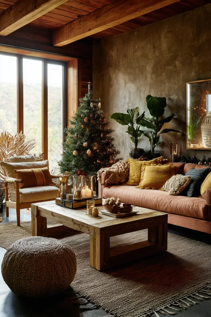 This living room pairs modern comfort with earthy elegance through a palette of soft blush, mustard, and golden brown. The Christmas tree stands simply adorned with gold ornaments and twinkling lights that match the glow of candlelight on the rustic wood coffee table. Natural textures fill the space, from the woven pouf and jute rug to the cozy knit throws and linen cushions. The plaster wall and exposed wood ceiling add just the right touch of organic charm, while leafy plants bring in fresh life and balance.