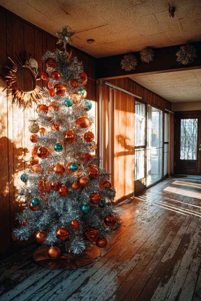 This bold setup feels like a nostalgic nod to midcentury holiday magic. The silver tinsel tree glimmers in the sunlight, perfectly paired with shiny orange and teal ornaments that pop against the wood-paneled walls. The sunlight streaming through the vintage blinds gives the whole space a honeyed glow, bringing warmth to the metallic sparkle. Even the worn wooden floors add charm, grounding all that shimmer in a setting that feels perfectly imperfect and full of character.
