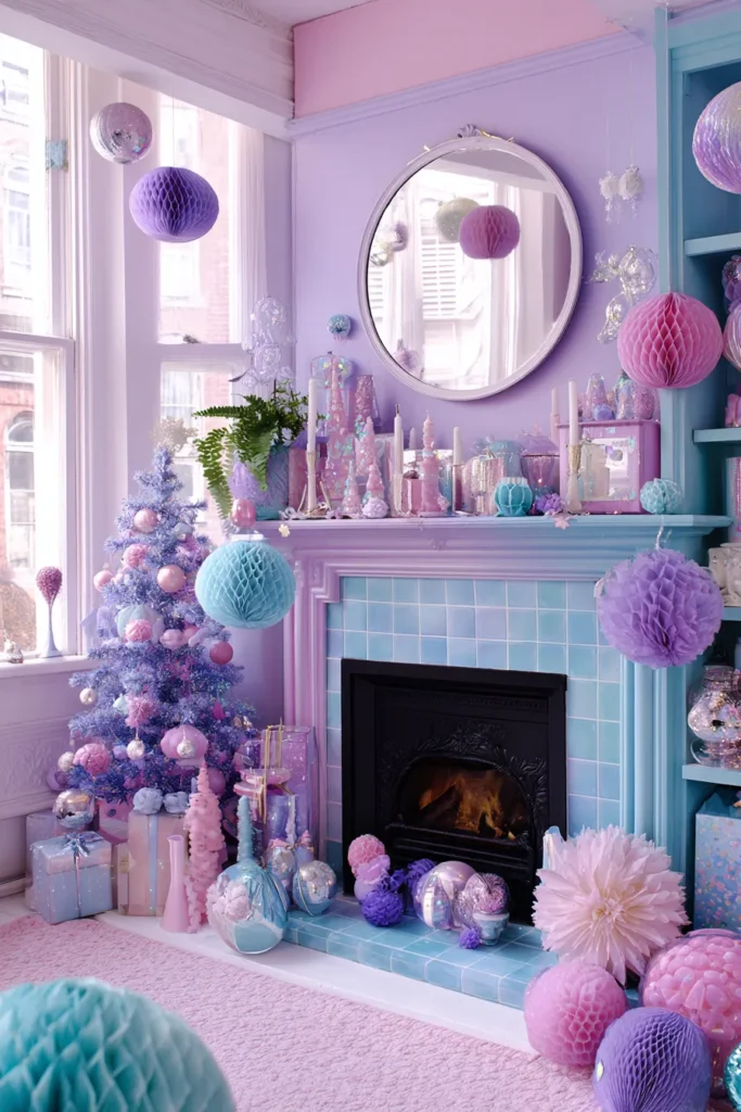 This room feels like stepping into a sugar-coated dream where Christmas meets a fairytale. The lilac and sky-blue walls set the sweetest backdrop for a pastel tree adorned with cotton-candy pink and icy blue ornaments. Every inch of the mantel glows with shimmer and sparkle, from iridescent baubles to glittery bottlebrush trees and glossy wrapped gifts. Honeycomb paper decorations float around the space like giant snowflakes, while the tiled fireplace in soft turquoise ties everything together with a touch of vintage charm.