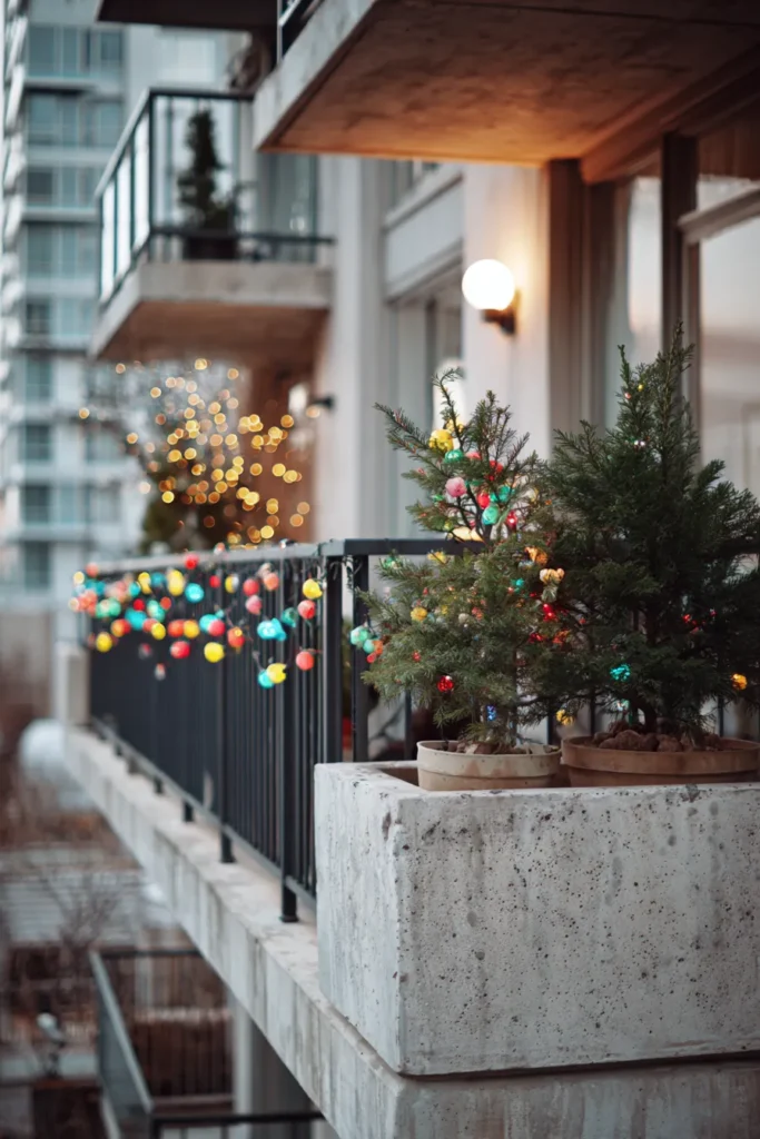 This small city balcony feels surprisingly festive with its colorful string lights and mini potted Christmas trees. The concrete and metal setting creates a cool urban backdrop that makes the bright bulbs and twinkling reflections stand out even more. Each light gives off a warm, nostalgic glow in shades of red, yellow, blue, and green, creating a cheerful contrast against the sleek modern architecture around it. The tiny evergreens add just the right touch of holiday charm without feeling cluttered.