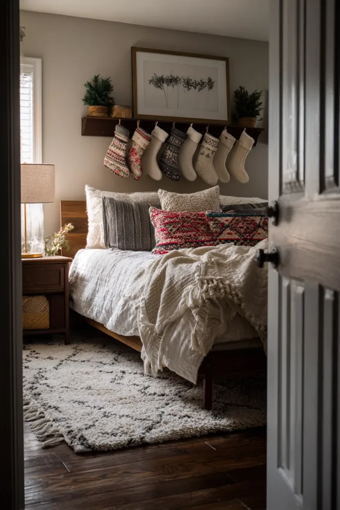 This bedroom feels like the definition of cozy holiday comfort. The neutral tones are warmed up with layers of soft knits, textured throws, and patterned pillows that bring in subtle pops of red and charcoal. Above the bed, a rustic wooden shelf doubles as a display for cream and patterned stockings, adding that sweet Christmas touch without overpowering the calm palette. The warm wood furniture and woven rug tie everything together, creating a peaceful retreat that still feels festive.