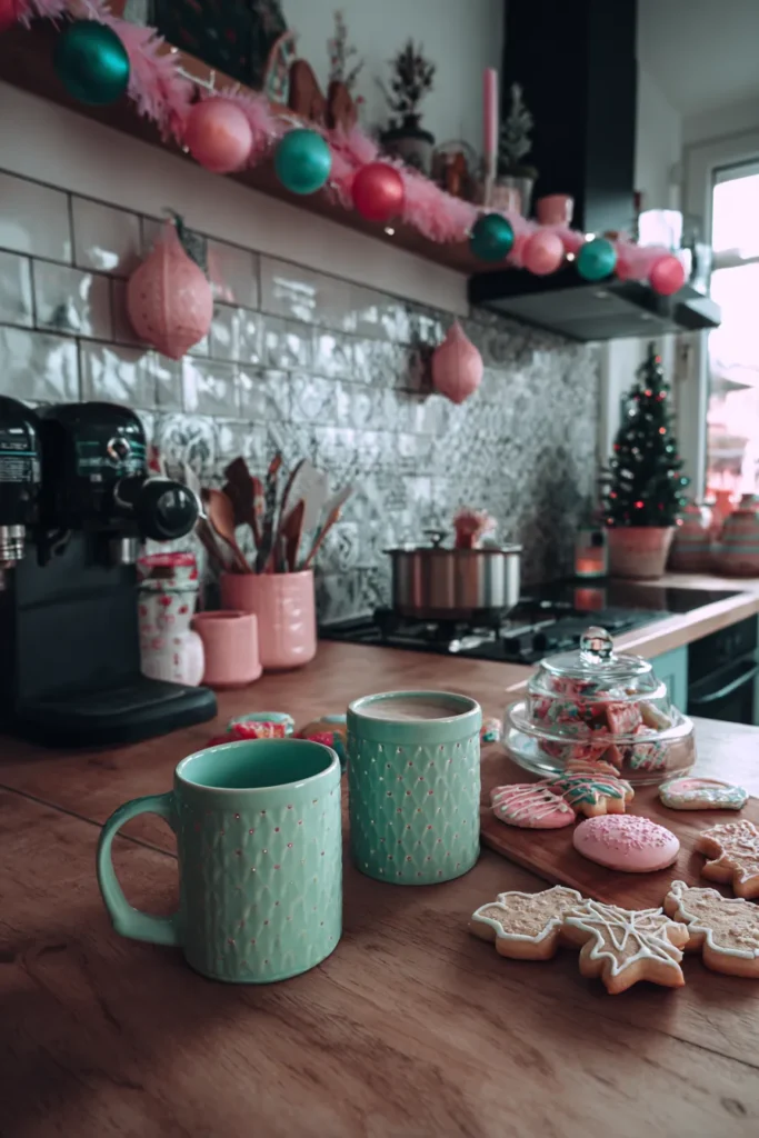 This kitchen feels like a holiday treat in itself, bursting with soft candy colors and cozy Christmas charm. The mint green mugs, pink ornaments, and teal garland draped across the shelf create a playful pastel palette that feels cheerful and nostalgic. The wooden countertop adds warmth, while the glossy white tiles and pops of pink keep the space feeling bright and festive. Every detail, from the jar of cookies to the mini Christmas tree, feels perfectly styled yet wonderfully casual.