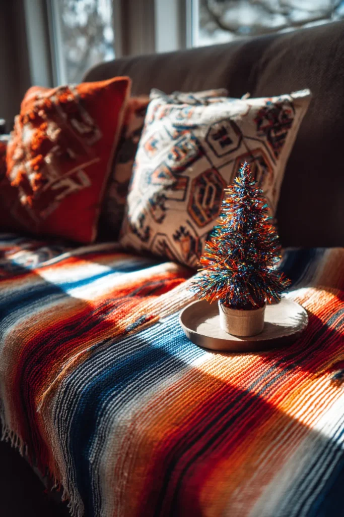 This cozy setup brings a burst of desert warmth to the holiday season. The sofa is styled with earthy pillows in rust and cream, paired with a woven blanket featuring vibrant stripes of orange, red, and turquoise. Sitting right on top is a tiny tinsel tree shimmering in matching colors, catching the sunlight that filters through the window. The textures feel rich and layered, blending rustic charm with playful holiday cheer.