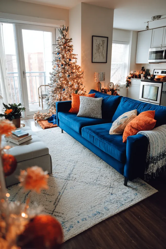 This living room feels bold, modern, and full of personality with its rich navy-blue sofa and bright orange accents. The Christmas tree glows softly in the corner, dressed in silver and blue ornaments that tie perfectly into the color scheme. Warm light from the kitchen garland and the nearby lamp adds a cozy golden tone, making the entire space feel balanced and inviting. The mix of textures, from the velvet couch to the knit pillows, adds depth and warmth that make the whole room feel effortlessly styled.