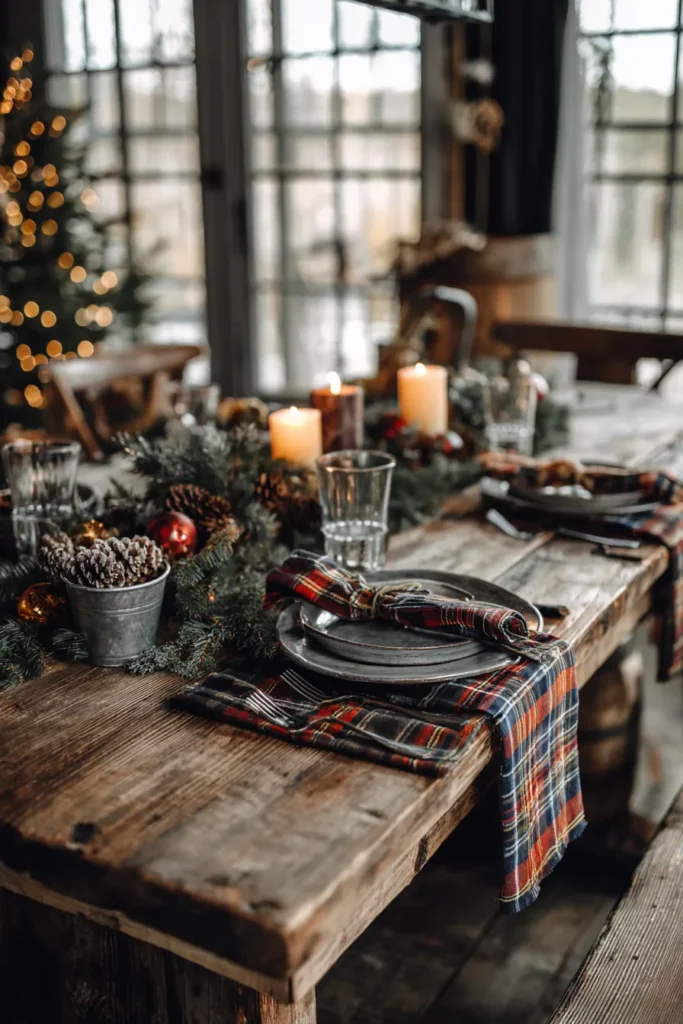 This dining setup feels straight out of a cozy cabin Christmas. The weathered wooden table is dressed with traditional red and navy plaid runners that instantly bring warmth to the space. Evergreen branches, pinecones, and gold ornaments run down the center, while candles cast the softest flicker of light across the plates and glassware. Every detail feels intentional yet relaxed, giving the room that perfect mix of rustic charm and holiday elegance.