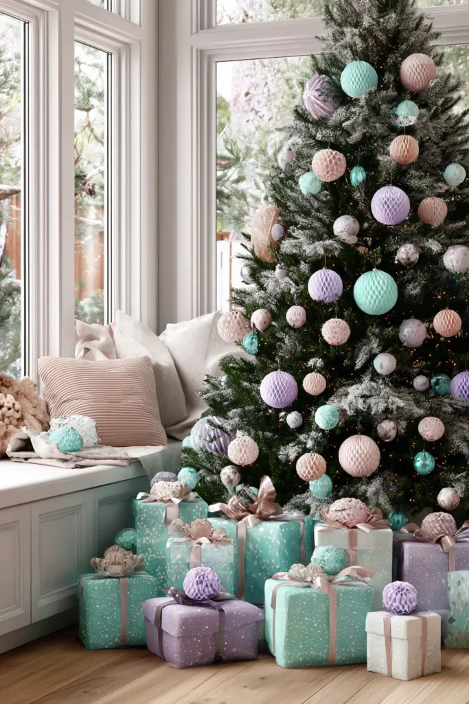 This corner feels like a soft winter dream with its frosted tree decked out in mint, lavender, and blush ornaments. The honeycomb-style baubles give everything a playful texture, while the pastel gift boxes below complete the look in perfectly wrapped coordination. The window nook, filled with cozy pillows and throws, invites you to curl up with a warm drink and watch the snow outside. The light pouring through the windows makes the pastel colors glow so gently that the whole space feels calm and magical at the same time.