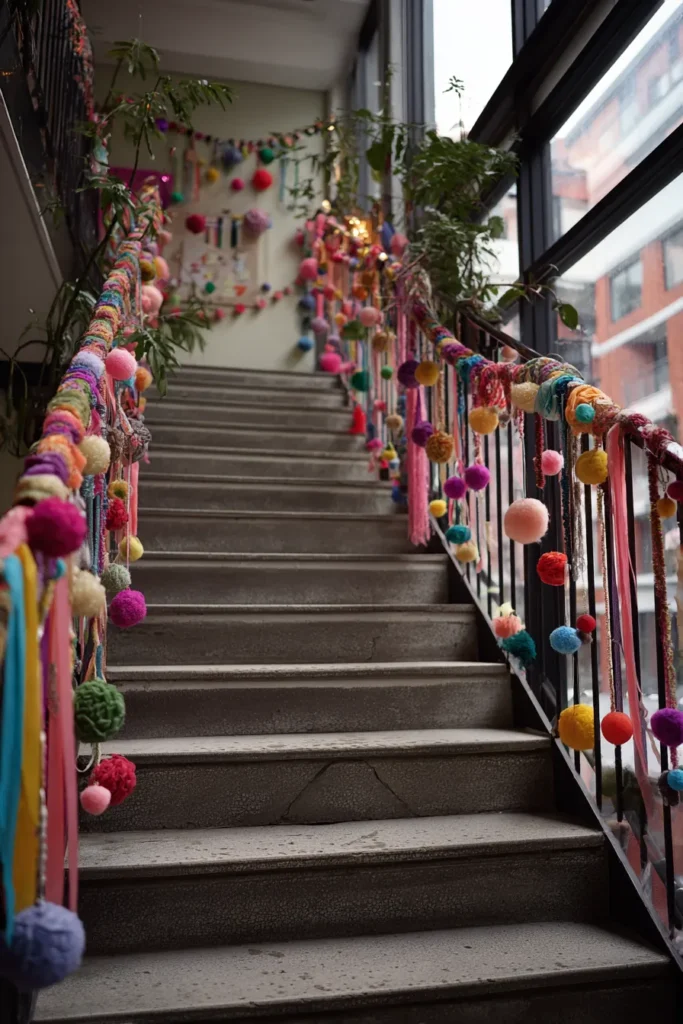 This staircase feels like a full-on Christmas party in motion. The railings are wrapped in strands of yarn, ribbons, and fluffy pom poms in every color imaginable, creating a rainbow trail that leads all the way up. Pops of pink, teal, yellow, and red fill the space with cheerful energy, while natural light from the large windows makes the colors glow even more. The mix of handmade texture and playful design gives off that artsy, joyful vibe that feels both cozy and creative.