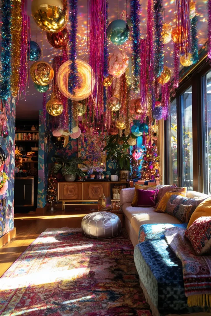 This living room is a total explosion of color and sparkle in the best way possible. The ceiling is draped with metallic tinsel, oversized ornaments, and shimmering garlands that turn the whole space into a glittering wonderland. Every surface reflects light, from the golden baubles to the jewel-toned pillows and the richly patterned rug. The mix of textures—velvet, silk, metallics, and sequins—creates an atmosphere that’s equal parts festive and luxurious, while still feeling full of warmth and fun.