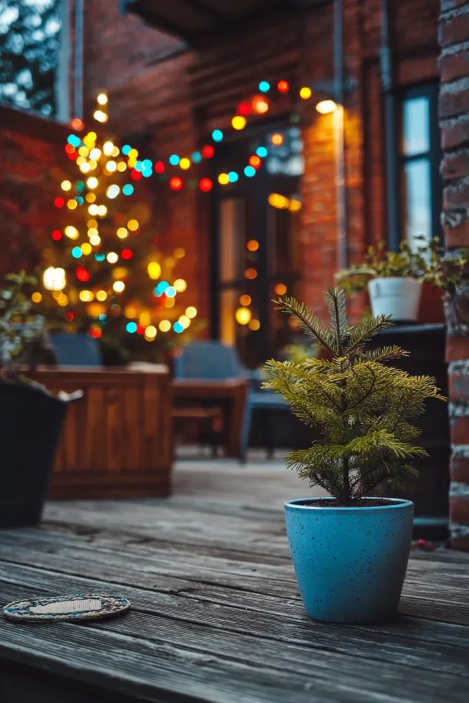 This outdoor setup feels like a cheerful little winter escape. The warm brick walls and wooden decking create the perfect rustic backdrop for colorful string lights and a glowing Christmas tree. A tiny potted evergreen in a bright blue planter adds a charming touch of personality, while the blurred lights in the background give everything that cozy, magical glow. It’s the kind of scene that feels both urban and homey at the same time.