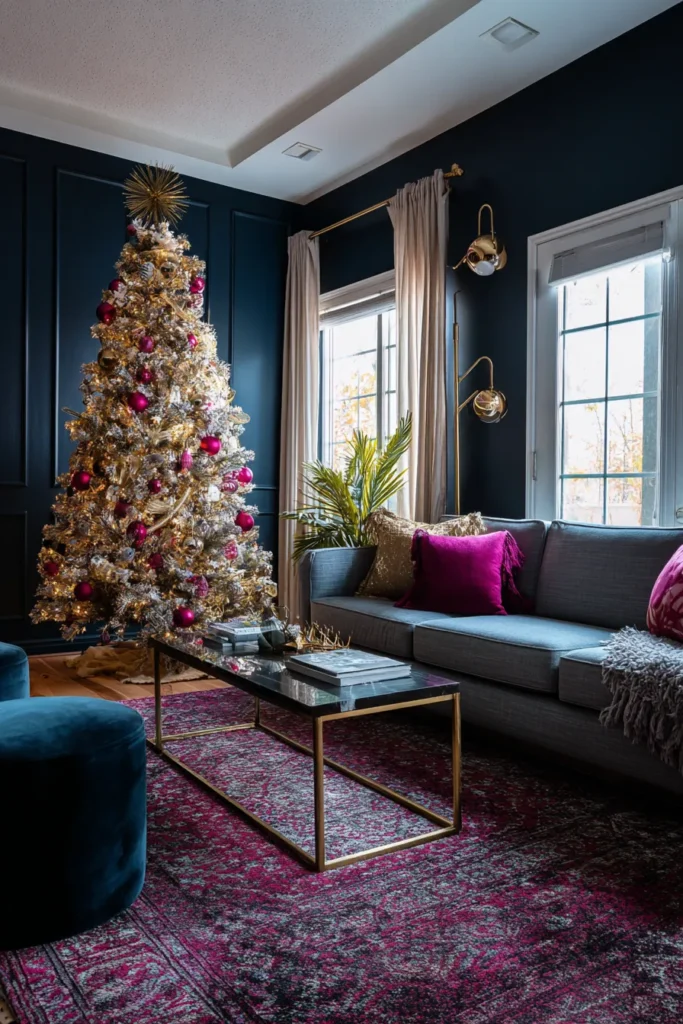 This living room feels rich and festive with its bold mix of magenta, navy, and gold. The metallic Christmas tree steals the show, shimmering with golden tinsel and hot pink ornaments that pop beautifully against the deep navy walls. Plush jewel-toned pillows and a richly patterned rug pull the color scheme together, while touches of gold in the lighting and coffee table add that extra bit of luxury. The natural light streaming in softens everything, making the whole room feel vibrant yet sophisticated.