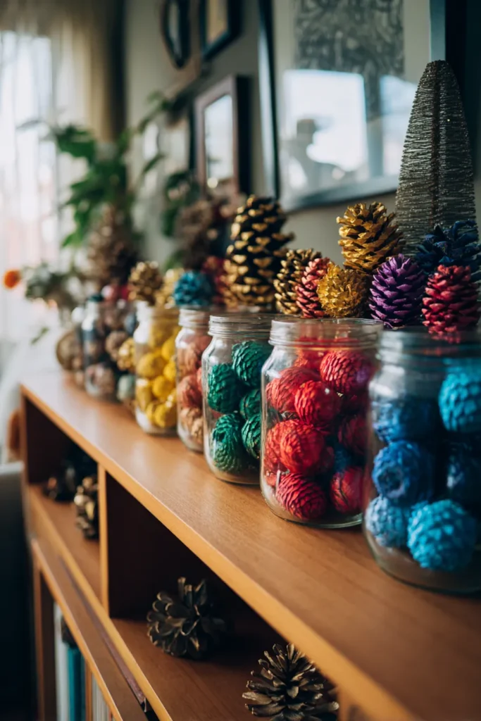 This setup is such a cheerful and creative take on Christmas decorating. A row of glass jars filled with hand-painted pinecones in every color of the rainbow sits neatly along a wooden shelf, glowing in the natural light. Shades of red, blue, green, yellow, and gold blend beautifully together, giving the space a fun, crafty energy. A few larger pinecones and metallic trees add extra height and texture, making the whole display feel balanced and festive without being overdone.