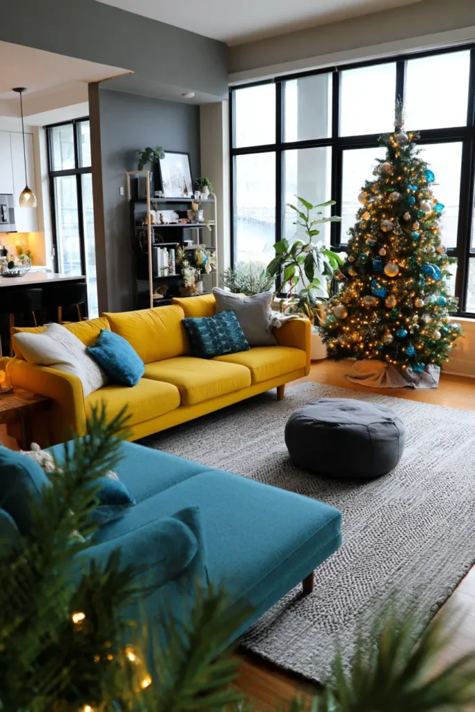 This living room feels like sunshine on a snowy day. The bold yellow sofa and teal sectional create such a happy contrast, perfectly matched by a Christmas tree dressed in teal and gold ornaments. Soft neutral walls and large windows keep the space bright and open, while touches of greenery and cozy textiles add warmth. The balance between color and calm makes everything feel modern yet full of personality.