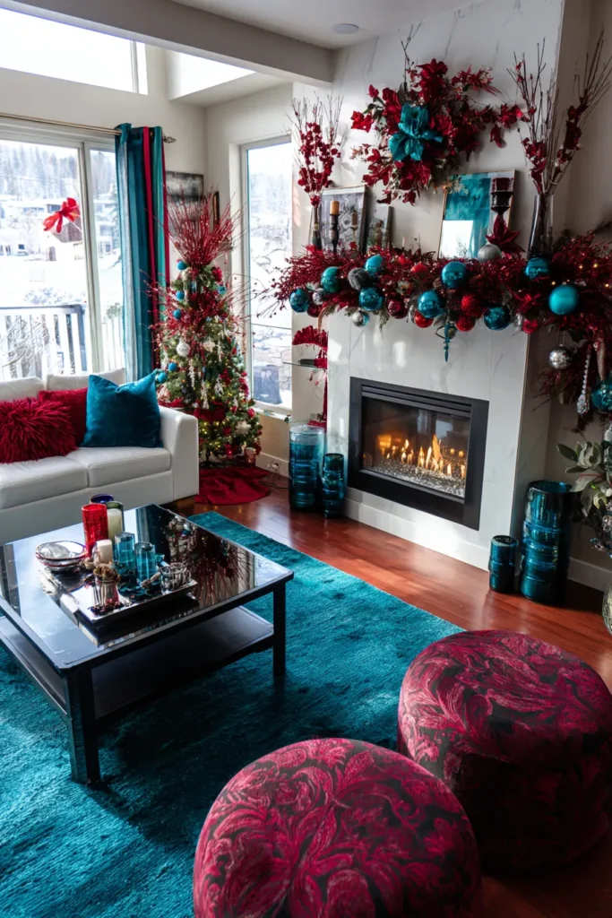 This living room looks like the holiday version of a modern fairytale. The bold mix of ruby red and teal gives the space a rich, glamorous energy that feels both festive and unexpected. The fireplace mantel steals the show, decked out with oversized ornaments, sparkly branches, and lush garlands that spill dramatically across the marble surround. Teal glass vases, plush pillows, and matching rugs tie everything together, while the soft glow of the fire makes it all feel extra cozy.