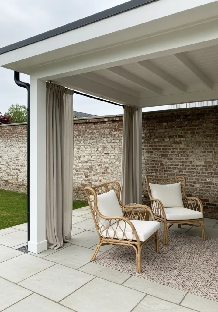This covered patio features a crisp white roof with exposed beams that instantly brightens the space. Soft beige outdoor curtains hang from the posts and can be drawn for added privacy or left open to frame the view of the brick boundary wall. The woven rattan lounge chairs with plush cushions sit on a textured outdoor rug, creating a comfortable seating zone that feels layered and inviting. Large stone pavers underfoot keep the look clean and structured, while the open sides allow plenty of fresh air to move through the space.