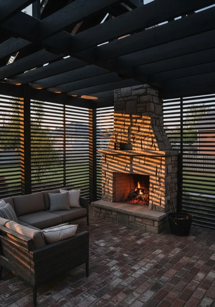 This dramatic covered patio combines dark overhead beams with horizontal slatted privacy panels along the sides. A central brick fireplace anchors the space and makes it usable even during cooler evenings. The seating is arranged around the fire, creating a warm and inviting focal point. The textured brick flooring adds depth and reinforces the cozy, sheltered vibe of the design.