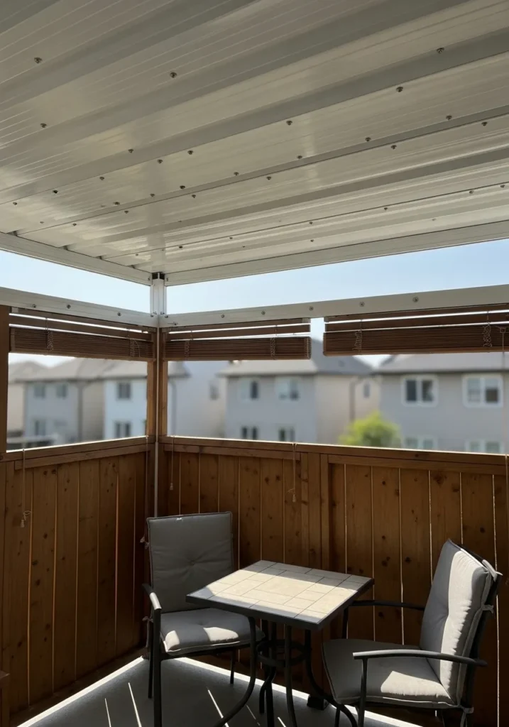 Compact Covered Balcony With Wood Privacy Panels