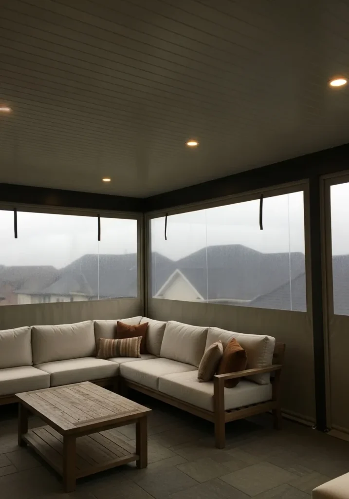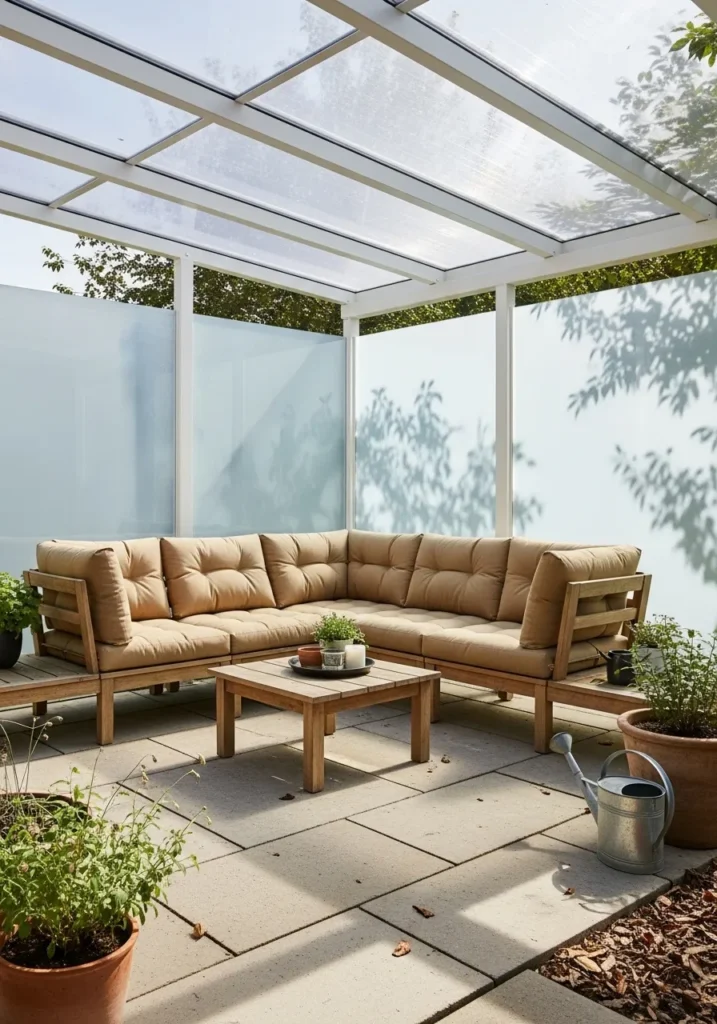 This covered patio features a transparent roof structure that allows natural light to pour in while still offering protection from rain. Frosted glass panels surround the seating area, creating privacy without blocking the view entirely. A spacious sectional sofa in warm neutral tones wraps around the corner, paired with a simple wooden coffee table for a grounded look. Potted plants add softness and bring the outdoor feel into the sheltered space.