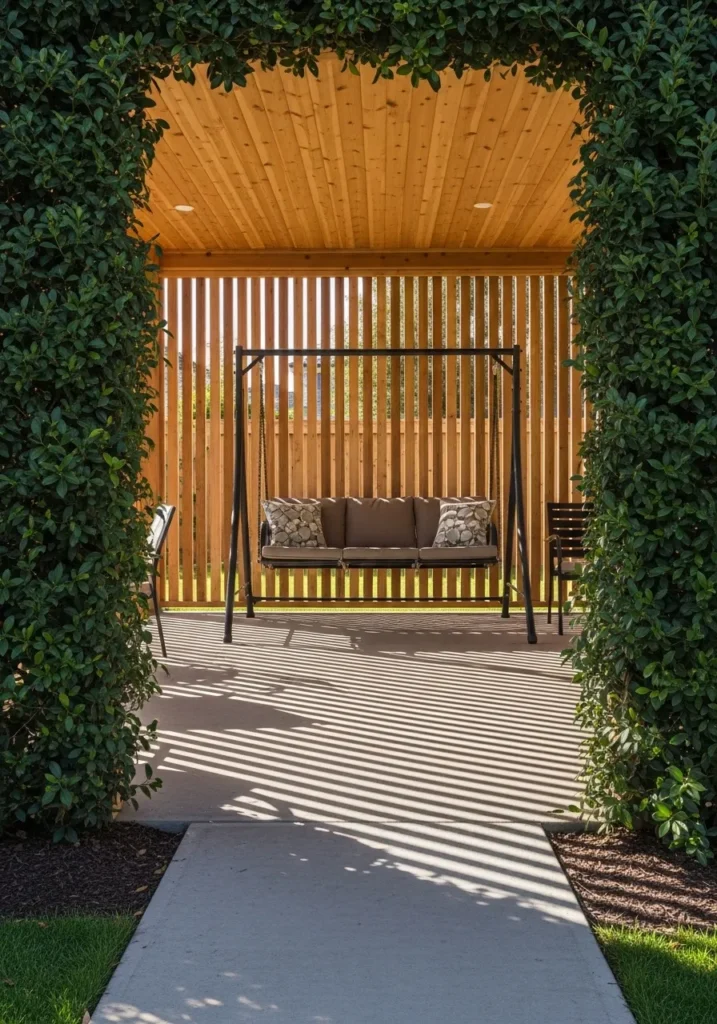 This covered patio is designed like a contemporary pavilion, framed by lush greenery that acts as a living privacy wall. The wooden slat backdrop filters light and creates soft shadow patterns across the floor. A cozy suspended bench sits at the center, inviting you to slow down and relax. The warm wood ceiling adds depth and warmth, while the surrounding plants make the entire structure feel like a hidden garden retreat.