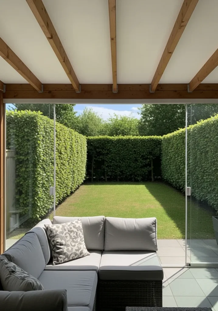 This covered patio uses sleek glass walls to frame a perfectly trimmed hedge that acts as a lush privacy screen. The exposed ceiling beams add a touch of warmth and contrast against the clean lines of the glass. A comfortable sectional sofa anchors the corner, creating a cozy indoor outdoor feel. The vibrant green lawn beyond the glass keeps the space fresh and bright while still feeling protected.