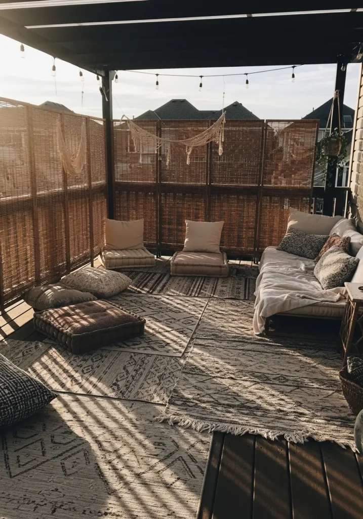 This covered patio embraces a relaxed bohemian vibe with woven privacy panels that wrap around the seating area. String lights are draped overhead, adding a soft glow once the sun sets. Layered rugs and floor cushions create a casual lounge atmosphere that feels inviting and comfortable. The natural textures of wicker, fabric, and wood give the space depth while still keeping it light and airy.