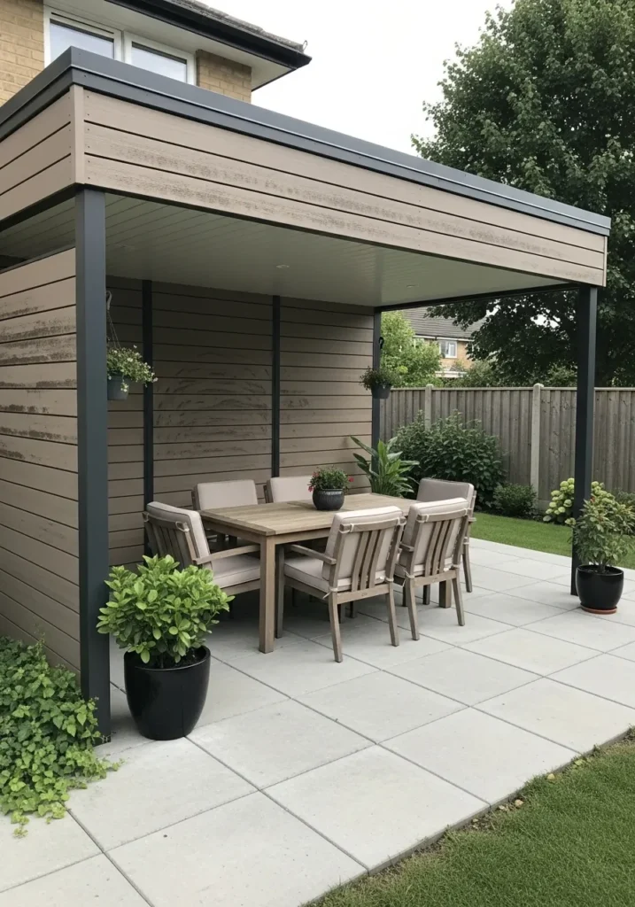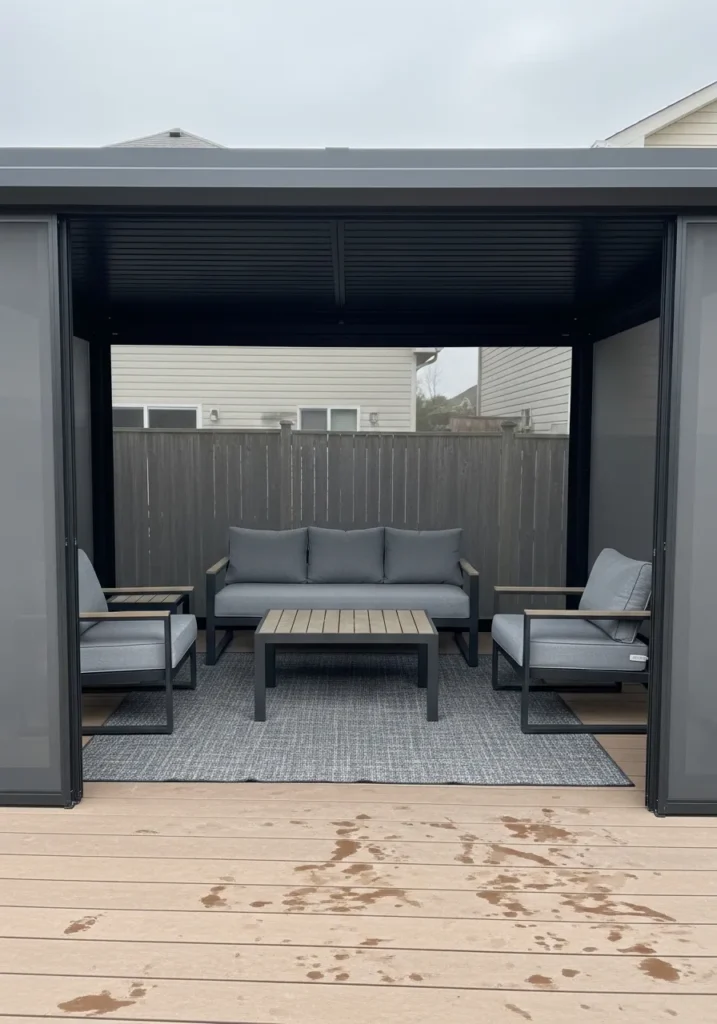 This covered patio features a sleek dark frame with sliding side panels that create instant privacy when needed. The clean lines of the structure give it a modern edge, while the neutral outdoor sofa and matching chairs soften the look. A simple rug anchors the seating area, making it feel like a true outdoor living room. The solid roof ensures protection from rain and harsh sun, turning the patio into a reliable all weather space.